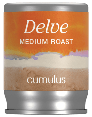 An opened pack of Delve medium roast coffee capsule next to a cup of coffee